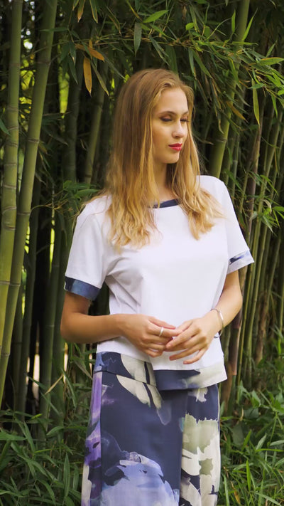 Scooped neckline t-shirt made of a fine jersey of pure Egyptian Mako extra-long stipes cotton enriched by a gradient printed fabric neckline and edging. Loose wearability for a fresh and pleasant touch on your skin.